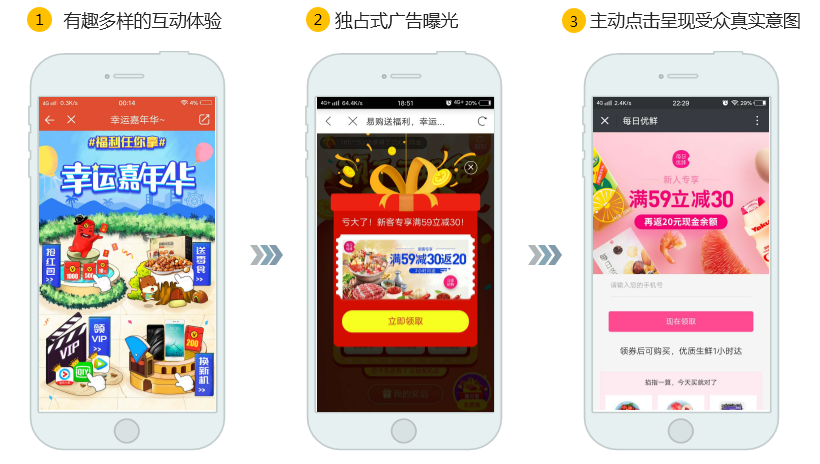 艾得互動(dòng)廣告以幾百種不同趣味廣告形式為主,在每個(gè)app首頁(yè)、發(fā)現(xiàn)頻道等放置廣告入口,點(diǎn)擊即可進(jìn)入活動(dòng)頁(yè)面,用戶有多次抽獎(jiǎng)機(jī)會(huì),將廣告主的優(yōu)惠券、紅包、VIP特權(quán)等設(shè)置為其中一個(gè)獎(jiǎng)品,根據(jù)用戶的活躍程度、以往的行為偏好、使用的手機(jī)型號(hào)(安卓或iOS)、IP所在城市等一系列用戶畫像進(jìn)行匹配,當(dāng)屬性匹配的用戶抽獎(jiǎng)時(shí),會(huì)抽中對(duì)應(yīng)獎(jiǎng)品,完成一輪廣告投放。