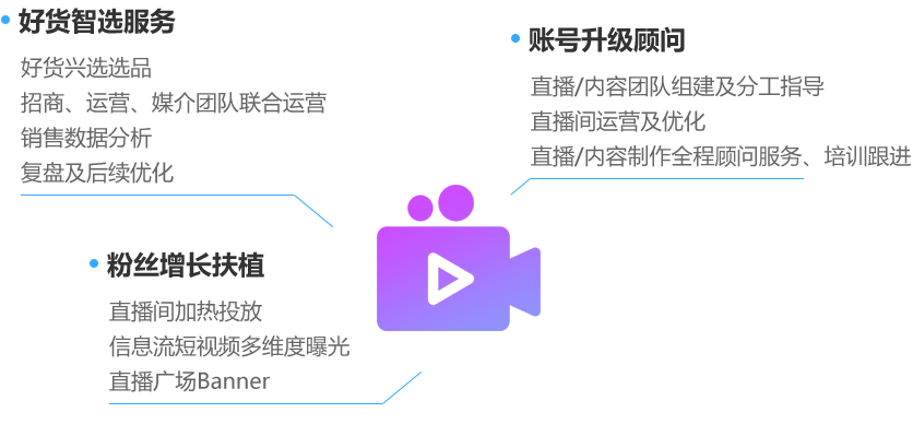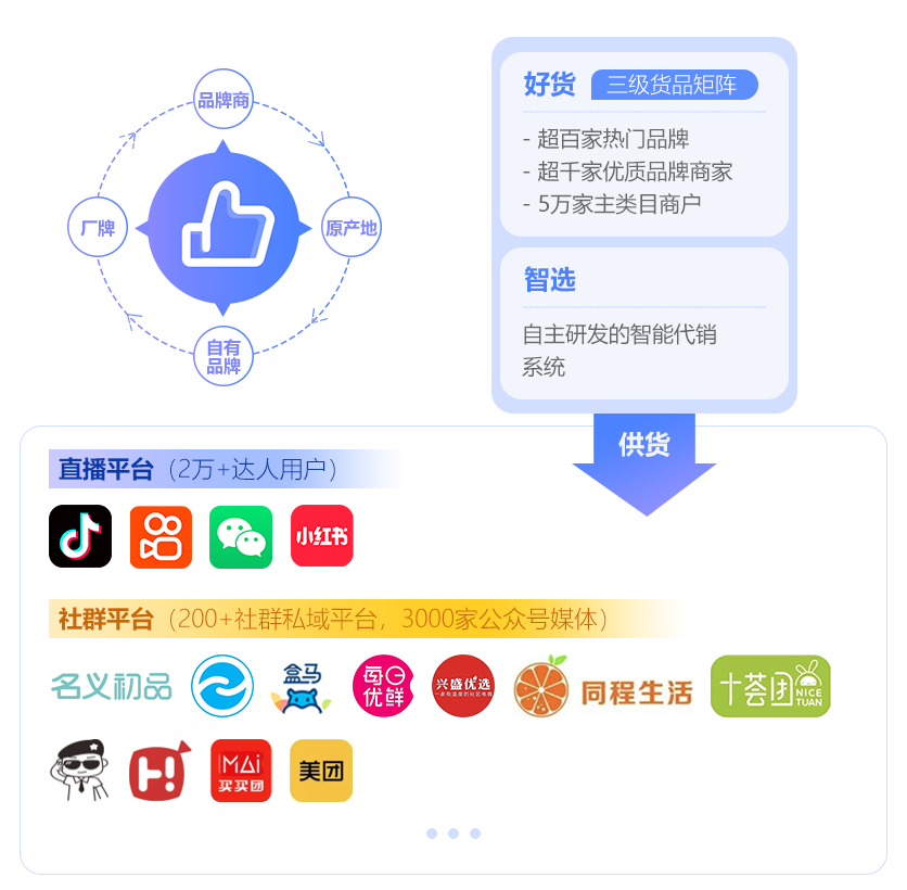 通過好貨興選智能選品供應(yīng)鏈和云數(shù)據(jù)分析,為達(dá)人提供個(gè)性化智能選品與供應(yīng)鏈服務(wù),同時(shí)借助億瑪精準(zhǔn)營(yíng)銷技術(shù)與專業(yè)服務(wù)優(yōu)勢(shì),為達(dá)人提供專業(yè)引流與內(nèi)容升級(jí)扶持,實(shí)現(xiàn)達(dá)人的直播帶貨轉(zhuǎn)型升級(jí)與可持續(xù)的粉絲及商業(yè)變現(xiàn)成長(zhǎng)。